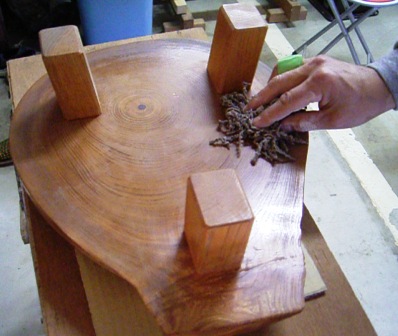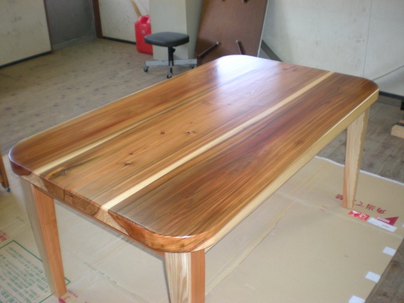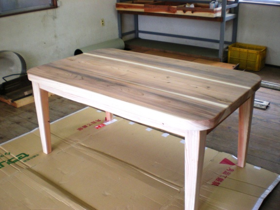 ▼工程順序 サンダーやペーパによる天板の木地調整 →柿渋下地 →漆塗り(生漆使用) →漆拭き(余分な漆を除去すると共に、素地に漆をよく摺りこみます) →ペーパー処理(から砥ぎ用のペーパーで、漆表面の研ぎを行います) ※漆塗り、漆拭き(漆を素材によく馴染ませながら摺りこみます)ペーパー処理の工程は 仕上がりの状態を確認しながら繰り返し行います。 |