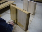 ▼工程順序 建具用羽目板塗装 →ローボード裏面塗装 →ローボード内部塗装 →ローボード天板・側面塗装 →建具塗装 オスモカラーウッドワックスウォルナット色仕上げ ※建具の羽目板塗装について 羽目板は無垢の木の性質上、収縮する場合があります。 羽目板の繋ぎ目となる実(サネ)部分を最初に塗装処理しておかないと、 建具として組み上げてから板が収縮して痩せた時に、 塗装していない部分が木地のまま白く正面に見えてきてしまい、 見栄えの悪いものになってしまいます。 これを防ぐ為に、建具として羽目板をはめ込む前に一度塗装しておきます。 |